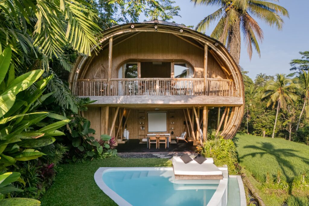 The Dome is a one bedroom bamboo villa built on two floors. Its ground floor houses an open air living room fitted with a dining area, a seating area and balinese style hammock.