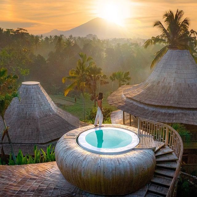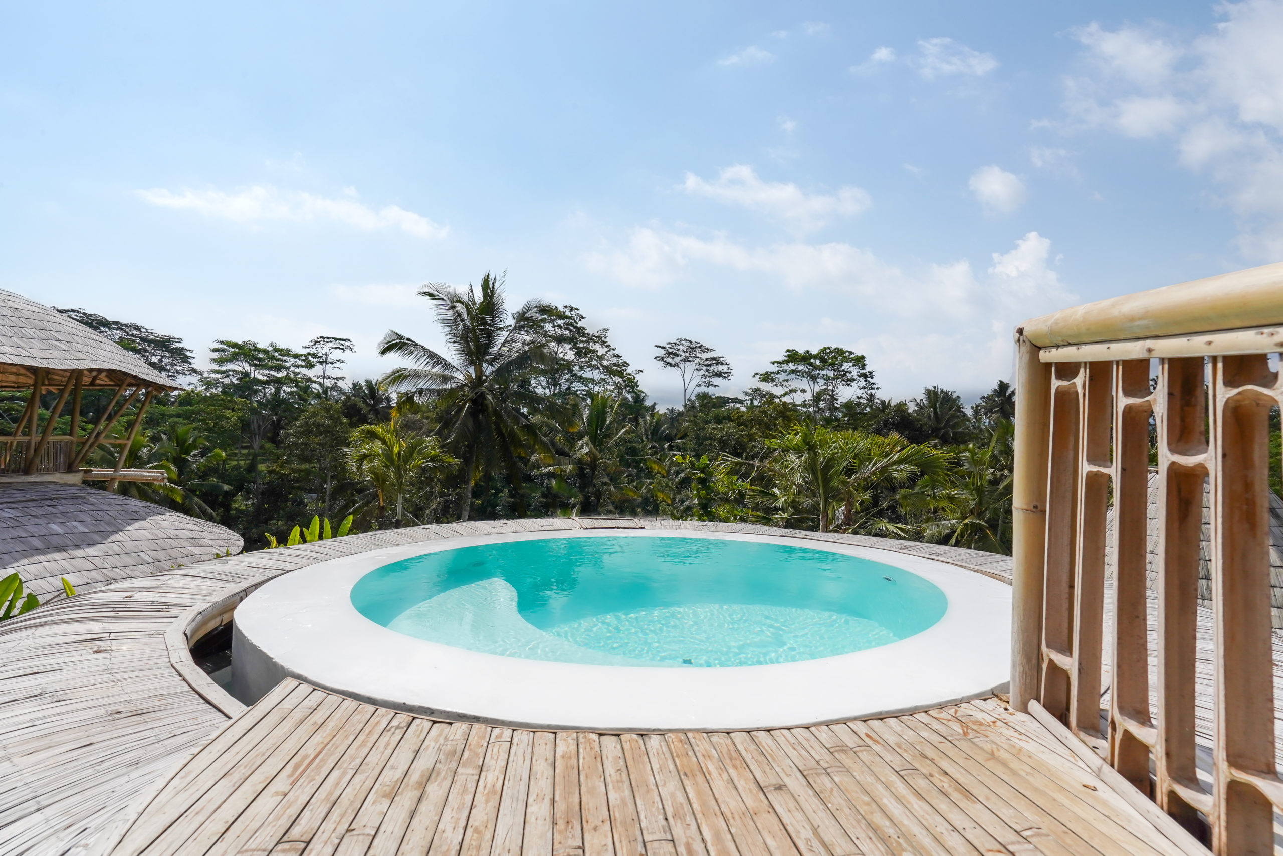 The Hut is a one bedroom bamboo cabin equipped with a uniquely designed rooftop round pool overlooking the rice fields and the famous volcano Mount Agung. Its layout includes a spacious bedroom fitted a king size bed, air conditioning, an open wardrobe, and an en suite bathroom that integrated an indoor bathtub overviewing the outside greenery. The bedroom has direct access to the outdoor patio fitted with a balinese style hanging chair placed in the midst of a cosy tropical garden.